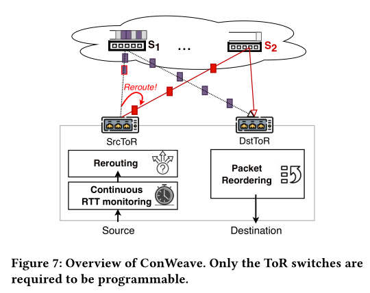 ? 设计了conweave,这是一个负载均衡设计,可以对活动流进行每个rtt的延迟监控,并利用上述网络中的数据包重排序方案,在屏蔽乱序数据包到达的同时进行路径切换。