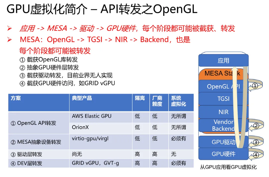 按照cuda 计算 stack和opengl 渲染 stack两个场景划分,又可以分为不同的虚拟化技术。如下图所示。