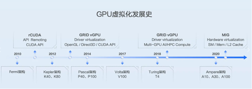 以上就是gpu目前的场景虚拟化技术,其实按照“空分”和“时分”只是一个大概分类,很多技术,如分片虚拟化其实是两者的结合。下图是nvidia gpu虚拟化的发展实际线: