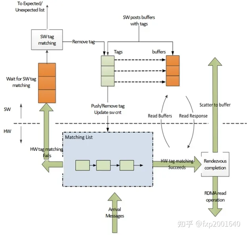 这里的矛盾在于常规网卡不touchpayload里的用户数据,所以理解不了envelope,这正是tag matching offload需要做的事:软件将tag matching list告诉网卡,网卡从接收报文的固定位置处读取envelope解析出tag,然后跟软件下发的tag matching list逐一比较,若命中则将接收的报文写入tag指向的缓冲区,并通过cq告知软件。这样软件收到通知时数据已被放置在{banned}最佳终目的地,而无需cpu再次搬运。