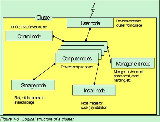 虽然由多种类型的节点,但并不是说一台计算机只能是一种类型的节点。一台计算机所扮演的节点类型要由集群的实际需求和计算机的配置决定。在小型集群系统中,用户节点,控制节点,管理节点,存储节点和安装节点往往就是同一台计算机,而这台计算机通常成为主节点(master node),这种情况下,集群就是由多个计算节点和一个主节点构成。下面我们分别解释这些类型节点的作用。