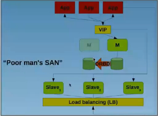 高可用软件加drbd其实在架构上跟san是相同的,唯一不同的是没有使用san网络存储,而是使用local disk实时复制磁盘数据,虽然没有mysql replication那样主从有数据不一致性,但是drbd实时复制数据在性能上有很大的影响,网上有人测过大概是降40%性能。
