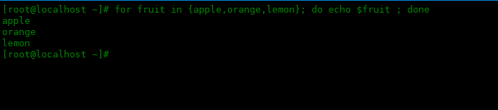 [root@localhost ~]# for fruit in {apple,orange,lemon}; do echo $fruit ; done