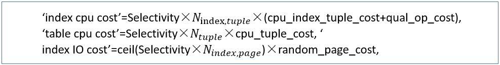 ‘run cost’=(‘index cpu cost’ ‘table cpu cost’) (‘index io cost’ ‘table io cost’)