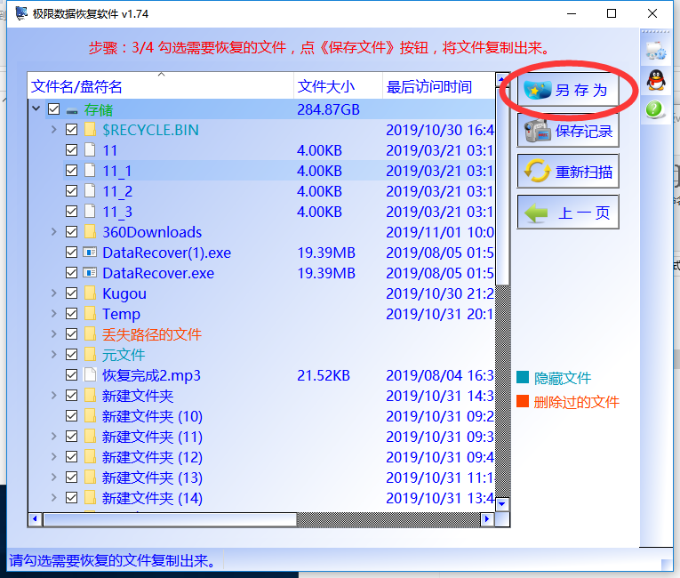 步骤3:勾选所有需要恢复的数据,接着点右上角的《另存为》按钮,将勾选的文件copy出来。