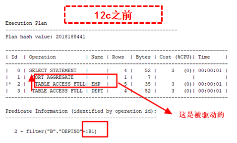从上面执行计划可以看出,虽然驱动的a-rows有108k行,但是因为distinct数目是11,实际上标量子查询只执行11次,由此可以看出,oracle内部构建了缓存存储键值对,从而减少子查询执行次数,达到优化目的。